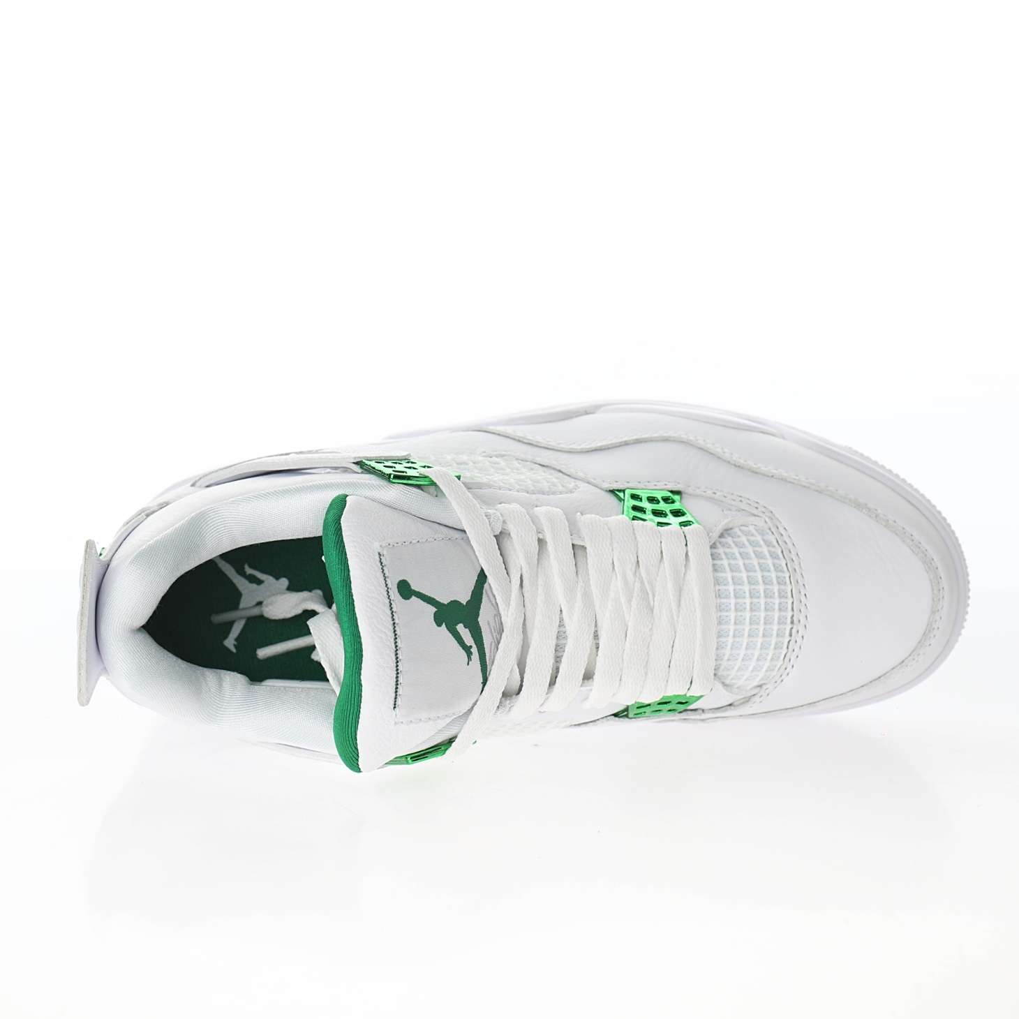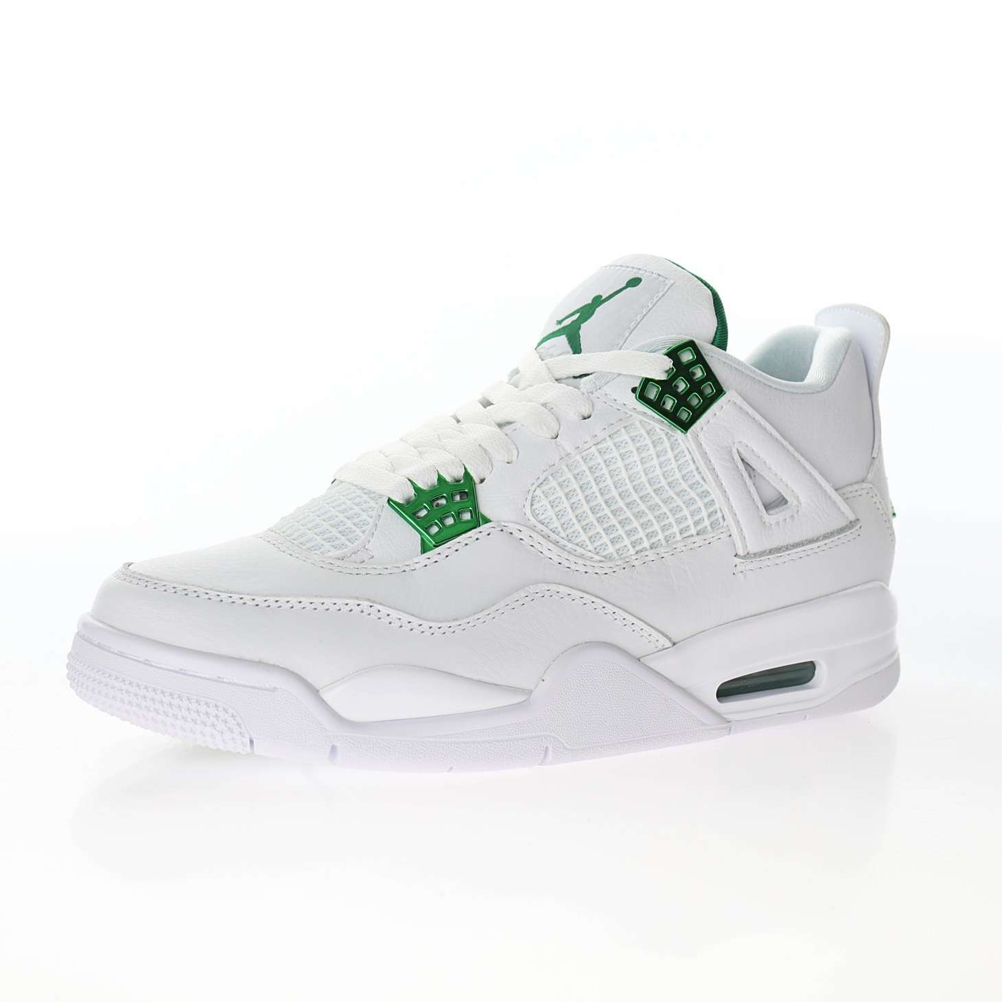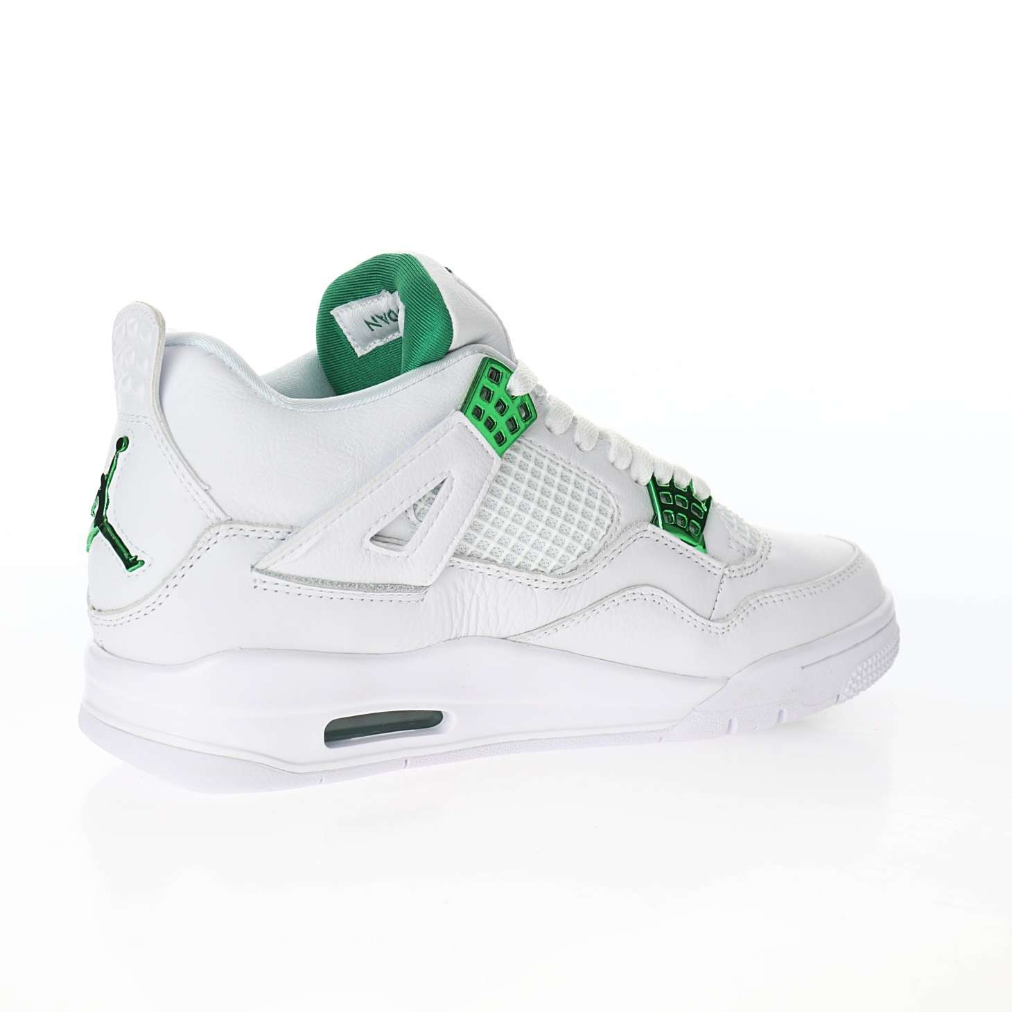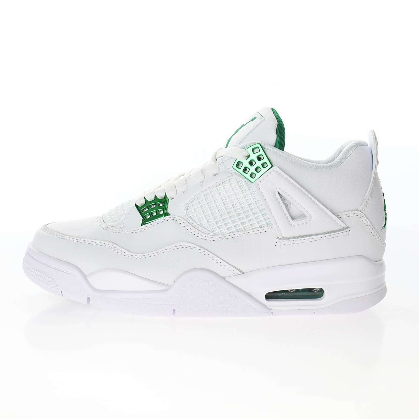 - Estilo audaz y vibrante: El Air Jordan 4 «Metallic Green» presenta una combinación enérgica de tonos verdes metálicos con detalles en negro y blanco. Estos colores vibrantes le otorgan un aspecto fresco y llamativo, perfecto para los fanáticos de la moda urbana.