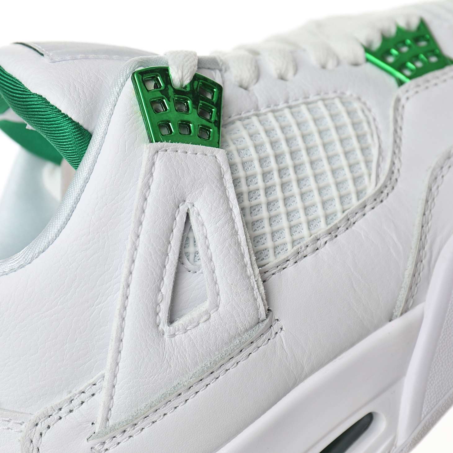 - Detalles icónicos de Jordan 4: El Air Jordan 4 «Metallic Green» mantiene elementos distintivos de la línea Jordan, como la jaula de soporte en los costados y el logo Jumpman en la lengüeta, rindiendo homenaje a su legado en la cultura del baloncesto.