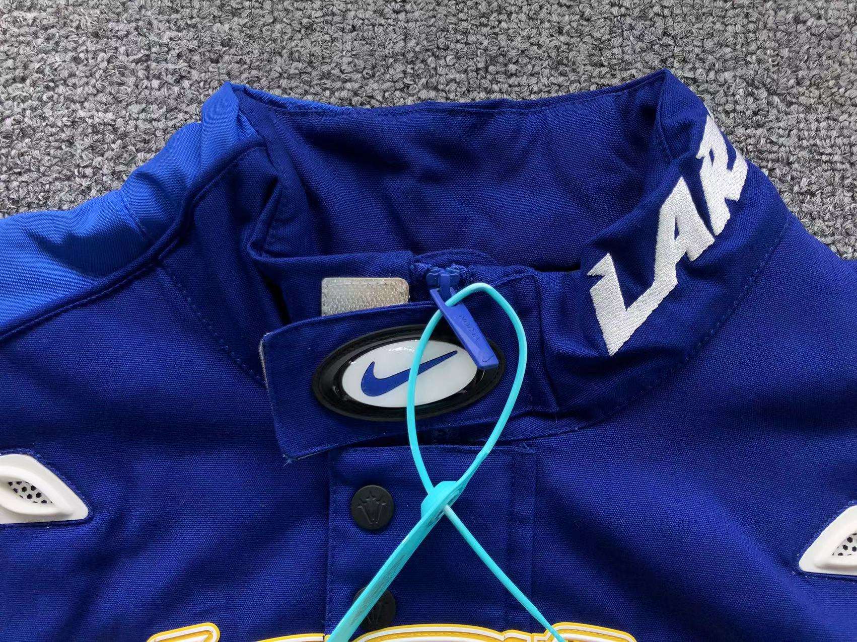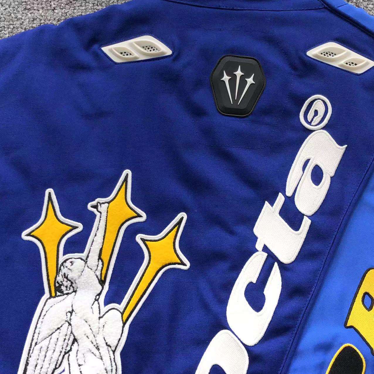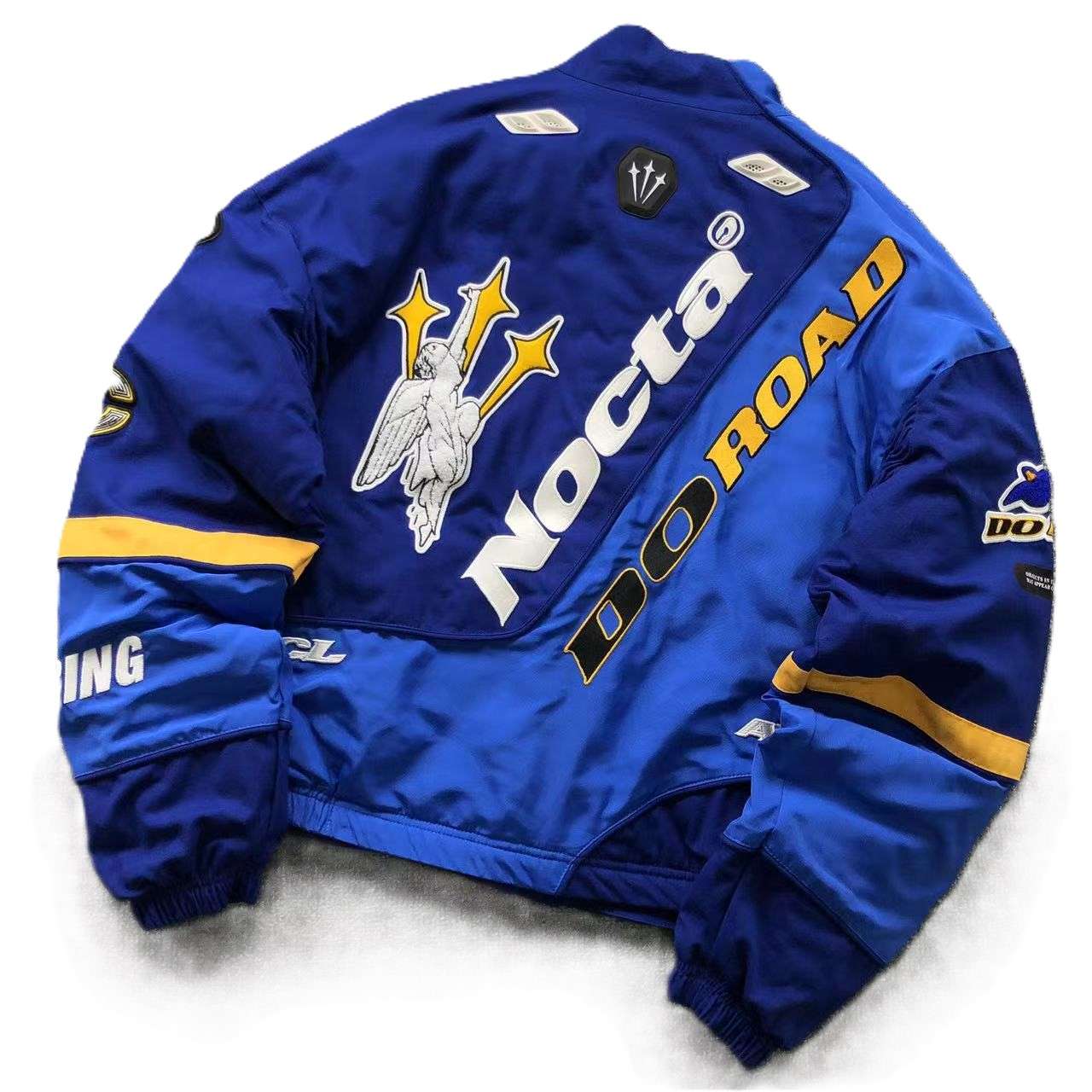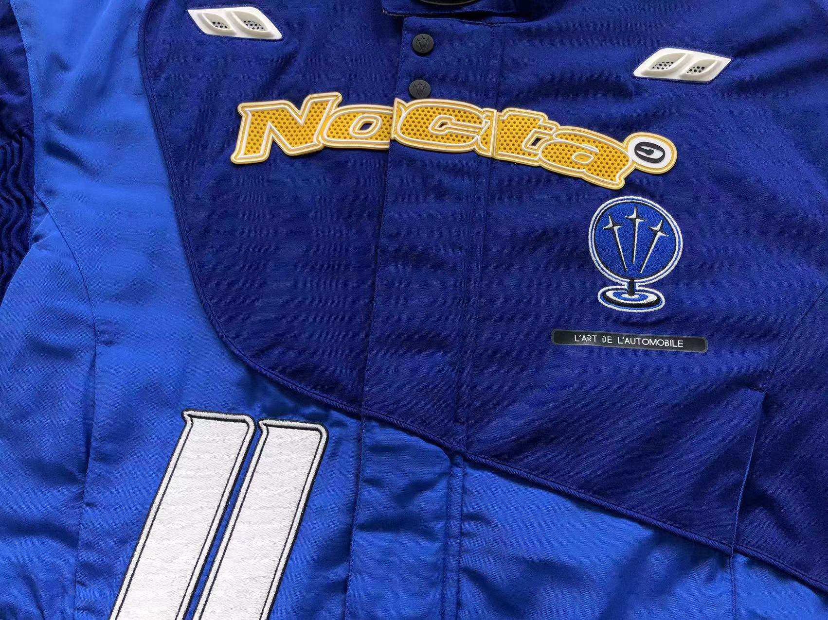 a chaqueta NOCTA x Nike «DO ROAD» Azul es una prenda exclusiva que fusiona la estética del streetwear con la inspiración en el automovilismo y la cultura urbana. Confeccionada en tonos azules vibrantes y detalles en amarillo y blanco, esta chaqueta destaca por su diseño audaz y su construcción de alta calidad.