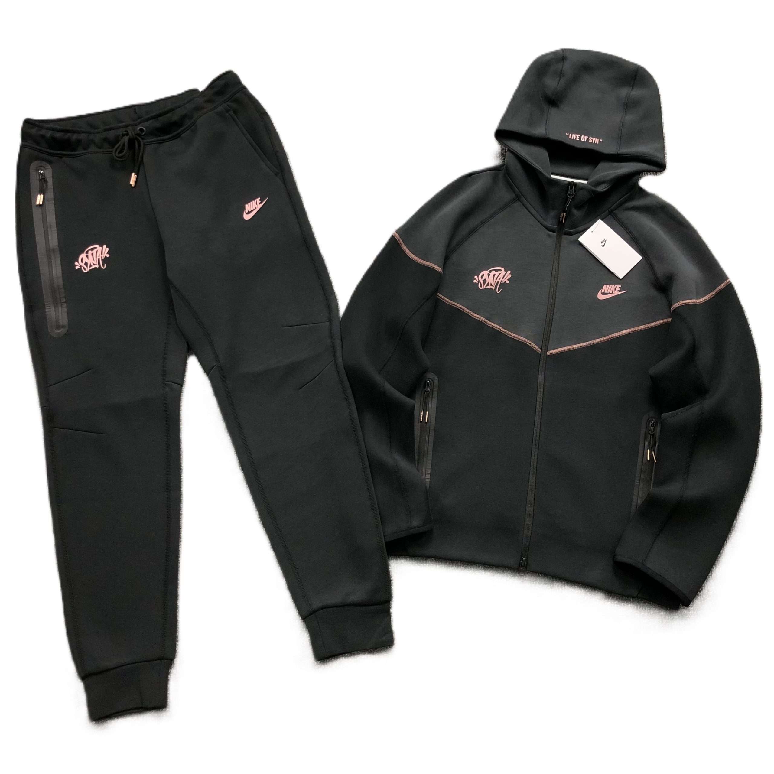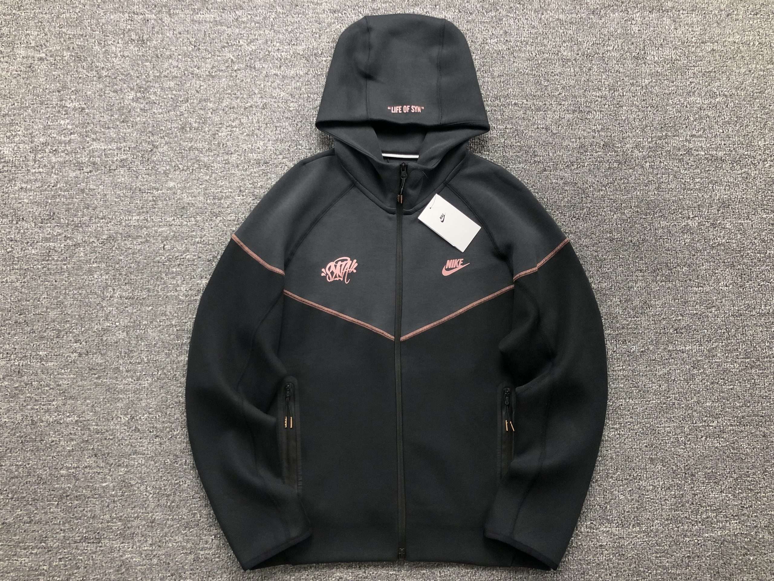 • Diseño Exclusivo: Logo Nike y detalles bordados en rosa, junto con la frase «Life of Sin» en la capucha.