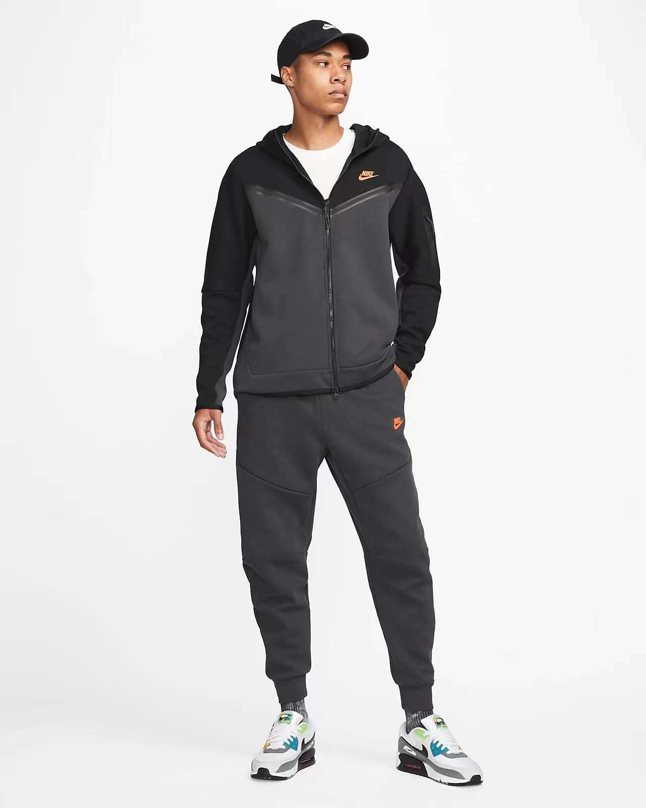 - Contraste audaz: El Conjunto de Chándal Nike Tech Fleece en Negro/Gris Oscuro fusiona el clásico negro con un gris oscuro distintivo, creando un look audaz y moderno.